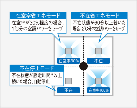 機能紹介在室率による省エネ運転 ムーブアイが室内にいる人数を検出。在室率を算出し、各室内ユニットごとに設定された省エネ運転を行います。 ※自動停止までの時間は60分~180分の10分単位で設定できます。 体験に進む *本画面はイメージ画像です。実際のアプリ画面ではありません。