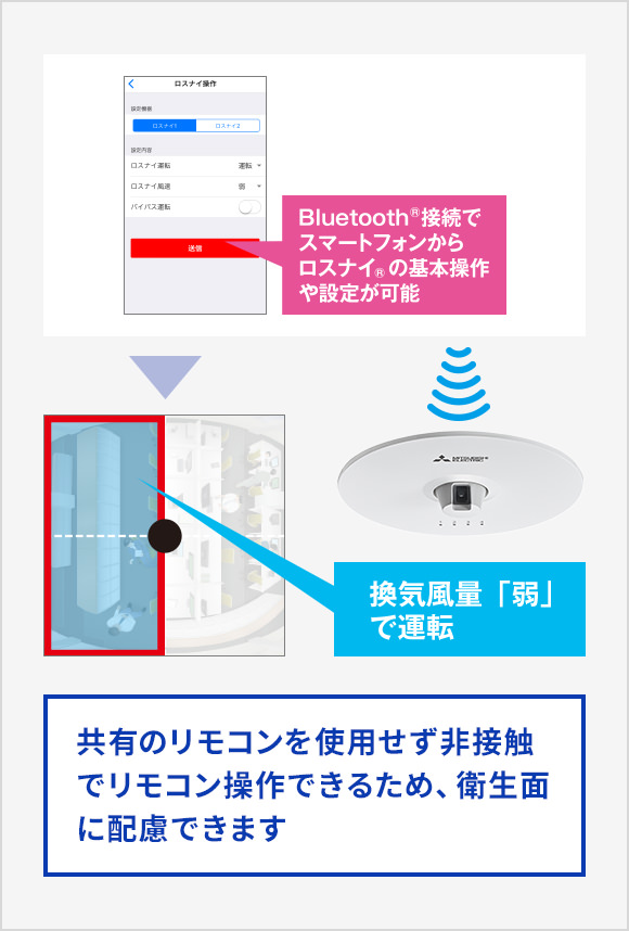 機能紹介ロスナイ®操作 ロスナイ®のON/OFFや風速切替え、バイパス運転のON/OFF操作をお手持ちのスマートフォンから行えます。 体験に進む *本画面はイメージ画像です。実際のアプリ画面ではありません。