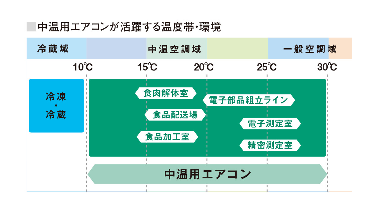 室温を一定温度の範囲に保ち、食品加工工場や調理施設などの温度管理のニーズに対応。