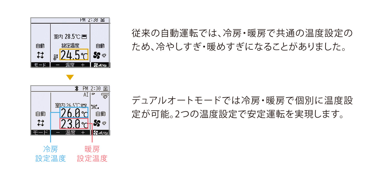 - *デュアルオートモードから従来の自動モードへの変更は可能です。ワイヤレスリモコンにて、自動モード(デュアルオートモード)をご利用の場合、据付工事説明書にしたがって、設定が必要です。