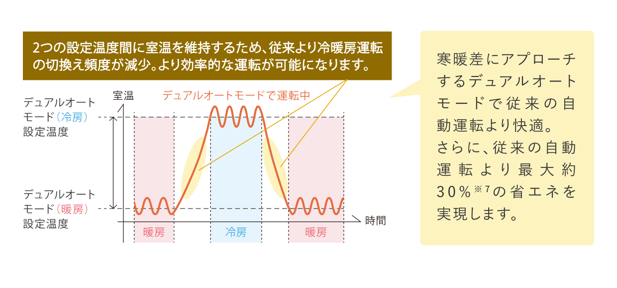 自動運転時に、冷房設定温度と暖房設定温度をそれぞれ設定し、室内温度に応じて自動的に冷房・暖房を切換え。室内温度を冷房設定温度と暖房設定温度の2つの設定温度間に維持するため、従来の自動運転より冷暖房運転の切換え頻度を減らし、最大約30%※7の省エネを実現します。