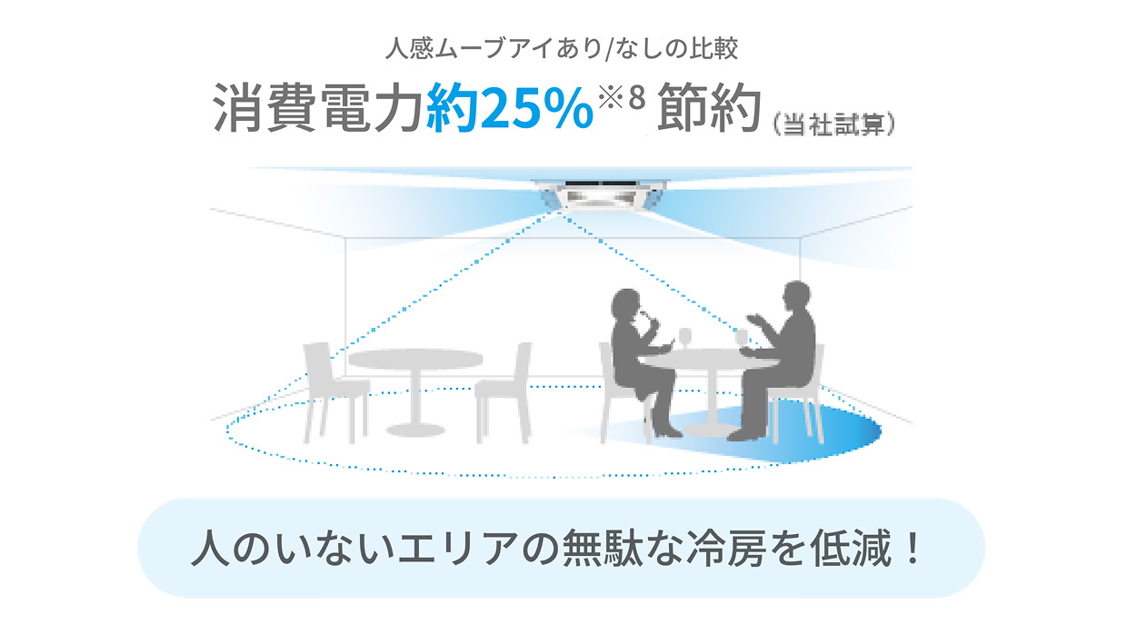 - ※8:PLZ-ZRMP140HF5での当社環境試験室において。外気温、空調負荷は当社が独自に想定した夏季モデルにて。冷房:人感ムーブアイの設定温度を28℃とし、人感ムーブアイ無しの機種(標準パネル使用時)は冷房立ち上がり時の体感温度が同一となるよう設定温度を25~26℃にした時の消費電力量比較。使用条件などにより数値は異なります。(当社調べ)。