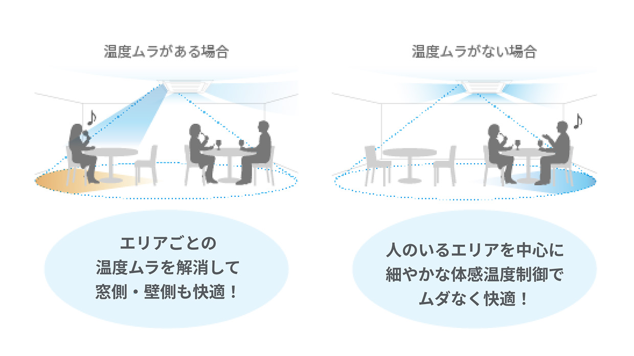 人のいるエリアを検知して体感温度制御するから、人に快適でムダが少ない。
