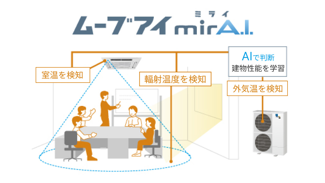 エアコンで検知できる多様なデータから、建物性能※9と幅射温度の影響を解析し学習。少し未来の室温変化を予測して運転でき、快適の実現に加えて冷やしすぎや温めすぎを防ぎ、省エネにも貢献します。