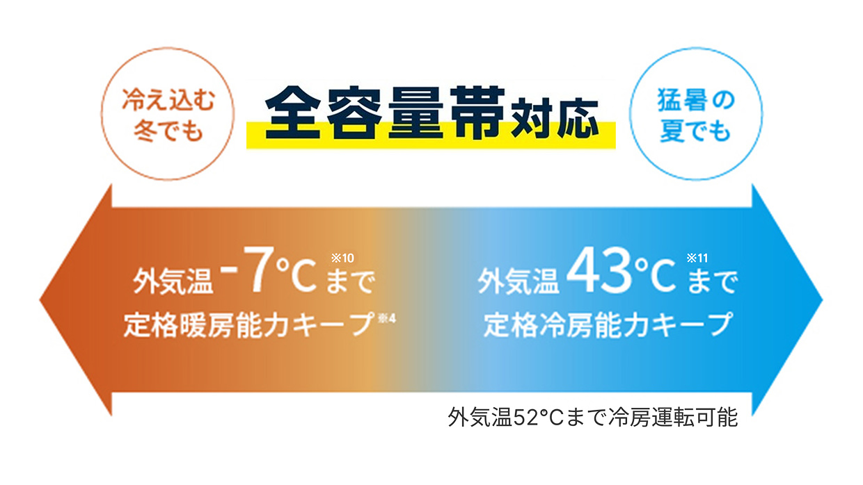 - ※10:乾球温度において。4方向天井カセット形〈i-スクエアタイプ〉接続時。その他の室内ユニット接続時は、−5℃(乾球温度)まで。