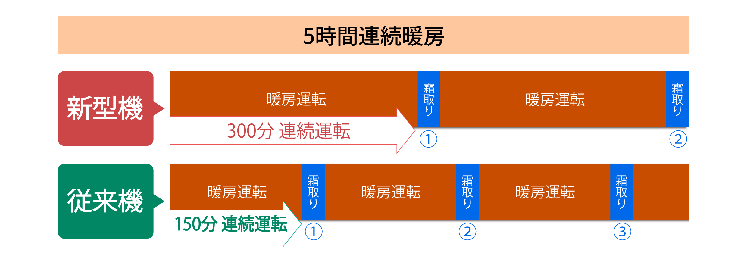 - *従来機PUZ-ZRMP・KA8/HA8/ZRP-KA12と新型機PUZ-ZRMP・KA15/HA15/KA5との比較。当社試験室(外気温−15℃)での最大運転時間。外気温条件により、連続運転時間は異なります。