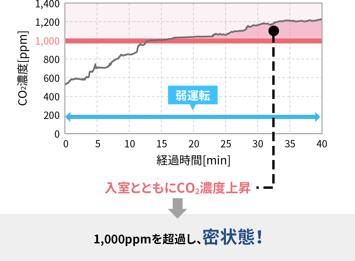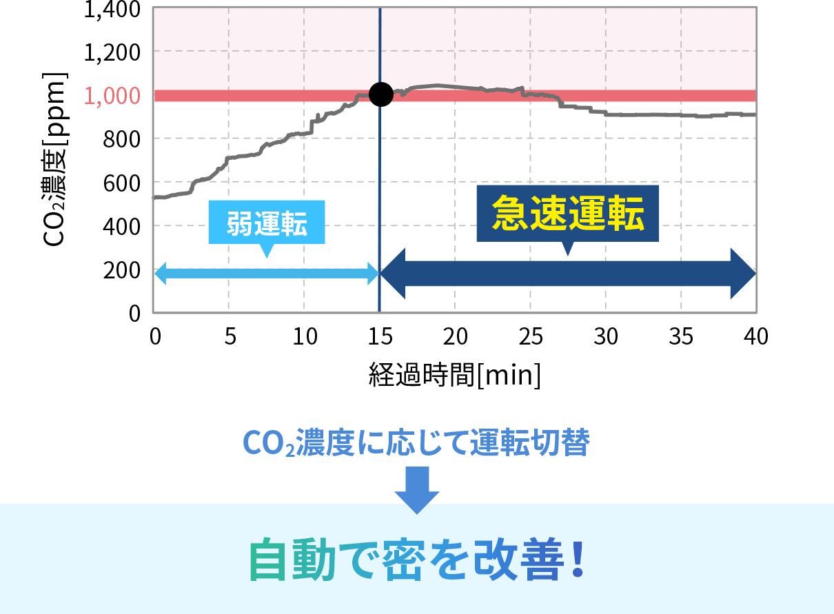 CO2濃度に従い「微弱 ↔ 弱 ↔ 強運転」となります