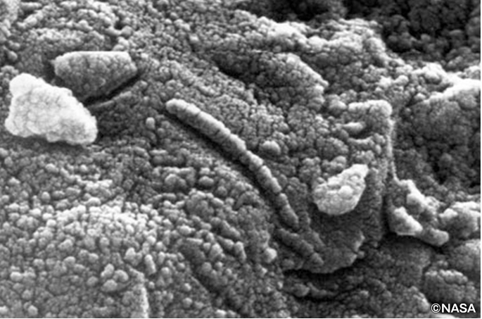 この隕石は宇宙空間に飛び出すまでの間、火星上で様々な事象を経験したに違いない。36億年前の火星は今よりも温暖であり、水も一時的に存在していた。この隕石にも、火星上の岩石だったころに、火星の水や大気がその内部にまでしみ込んでいたのである。マッケイ博士は、この隕石の水がしみ込んだあたりに、微生物のように見える有機物を見つけた。その有機物は確かに鎖状に連なって、岩石の上を這いつくばっているようにも見えた。