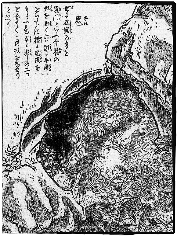 “世に丑寅(うしとら)の方を鬼門といふ 今鬼の形を画(えが)くには頭に牛角をいたゞき腰に虎皮をまとふ 是丑と寅との二つを合せてこの形をなせりといへり”