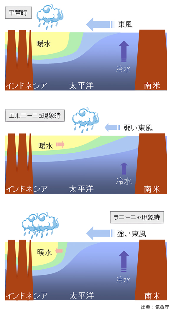 エルニーニョ現象とは、太平洋を巨大なプールに見立てたとき、その最西端であるインドネシアにある暖かい海水が、夏に太平洋の真ん中まで広がる現象のことをいう。逆に暖かい海水が全く広がらず、インドネシア近海のみにしかない場合をラニーニャと呼ぶ。
