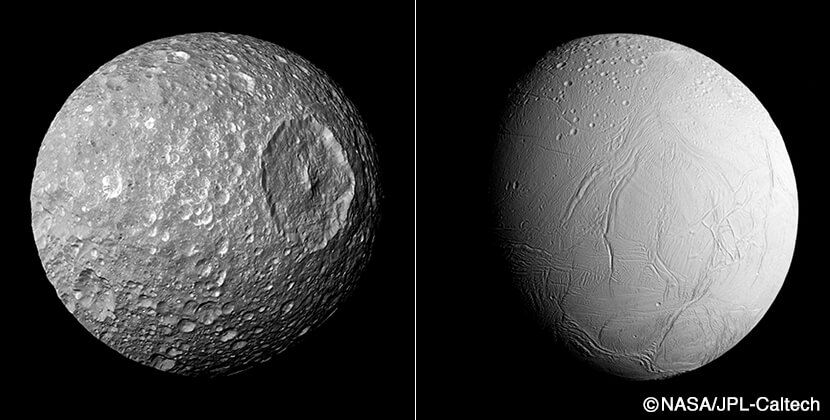 軌道的にほとんど差がない両者へ、衝突した小天体の数に違いがあろうはずがない。両者とも、過去には無数の天体衝突を経験した。このことはミマスのクレーターだらけの地表面から伺い知れる。