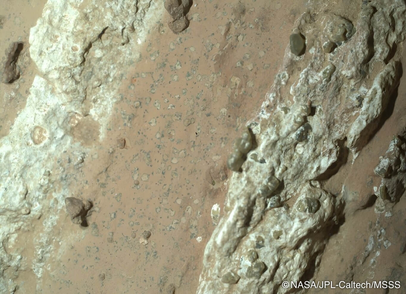 ノジュールとは、地層中にまるで埋め込まれたような小さな球状の塊である。周辺の泥や砂を構成する鉱物のサイズより明らかに大きい。たとえば、泥をなす鉱物粒子は通常100マイクロメートル(髪の毛の直径)よりも小さく、数10マイクロメートルほどである。一方、ノジュールは1ミリメートル程度、眼に見える大きさである。このノジュールが数10個も泥の岩石のなかに埋まっていた場所を、パーサヴィアランスは発見した。まるで、ヒョウ柄模様のようにも見える。泥の岩石のなかにいくつものノジュールが顔を出しているのである。これを見過ごさずに発見した、探査チームの観察眼には感服する。