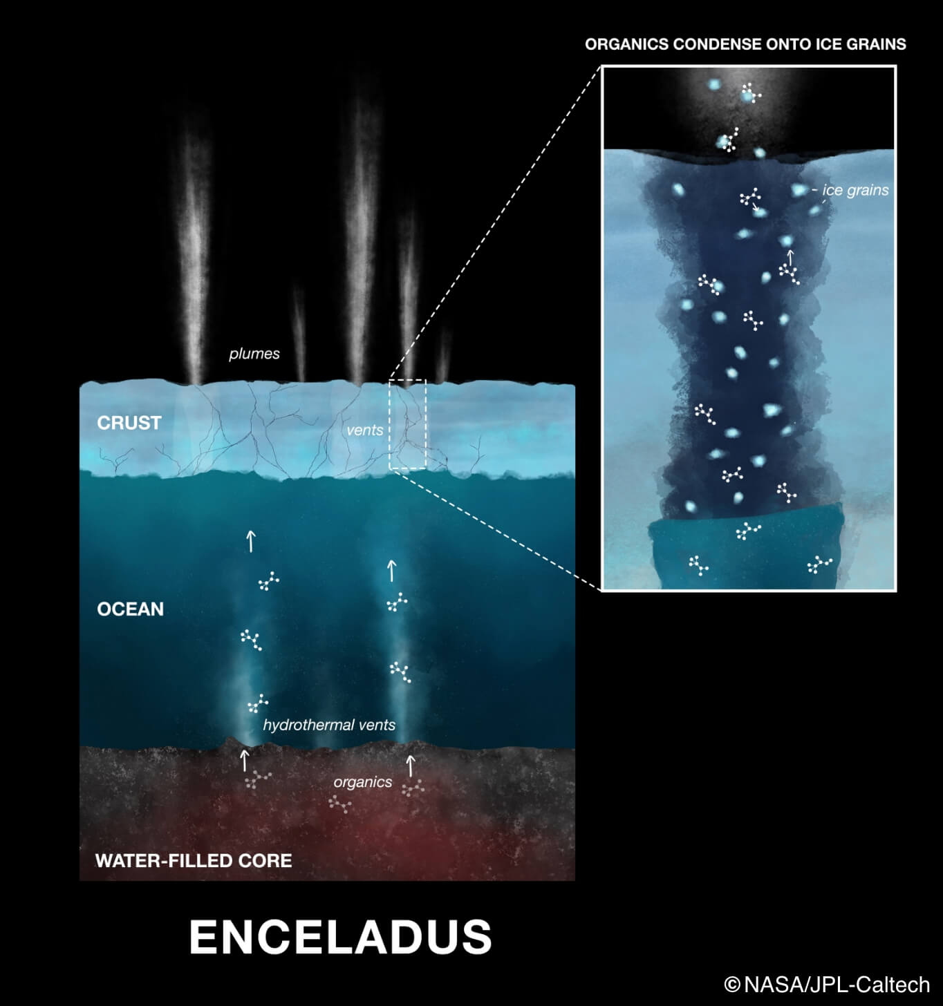 これまでエンセラダスには、液体の水、エネルギー、そして生命の材料となる有機物やリンが豊富にあることが確かめられている。地球上において、これら要素が満たされている場所には必ず生命が存在する。当然、エンセラダスでも生命の存在に期待が高まっている。今回の発見は、この地下海に含まれる生命の材料である有機物に関するものである。