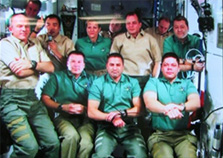会見で「五輪選手がんばって~」と親指を立てる野口飛行士。(後列左から二人目)