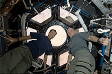 会見はNASAから始まった。米国メディアから繰り返し出た質問は、今回のシャトルミッションでとりつけられたキューポラ(展望室)について。「7つの窓を持つ展望スペースはどう?」との質問に「今まで白黒で見ていたのが高解像カラー画像で見られるようになったみたい」とか「地球が丸く見える」とか感嘆の声が飛行士から相次ぐ。
