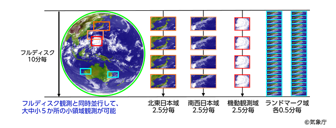 さらに8号で注目すべきは日本付近や台風など、特定の範囲を観測する領域観測が5種類あること。この領域観測を使って日本付近は約2.5分ごとに観測、さらに将来的には約30秒ごとに積乱雲などの観測を行う計画もあるという!。7号より格段に「高精細」に「高頻度で」積乱雲を観測することができるのだ。