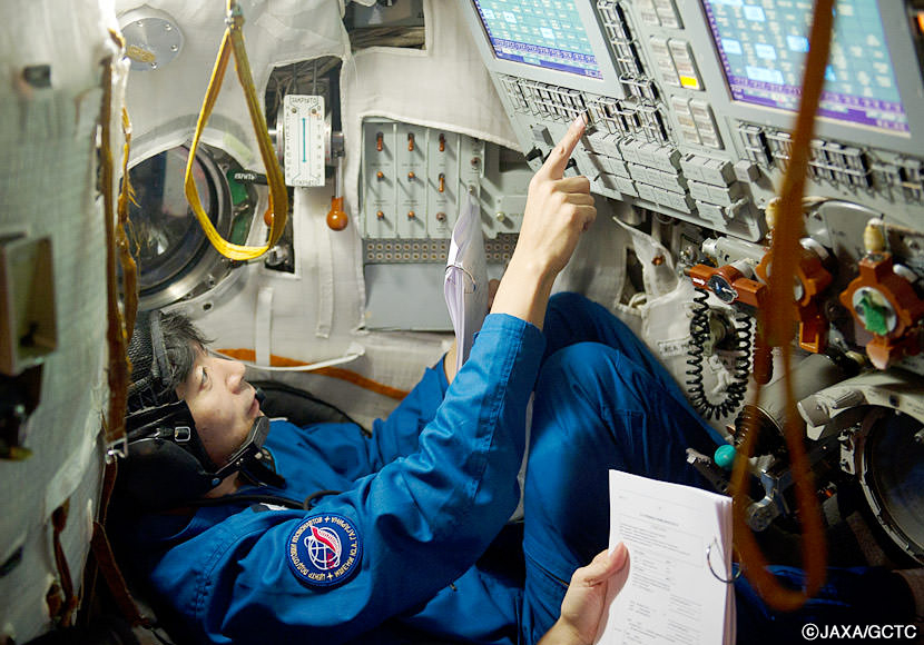 油井さんは自衛隊出身でF15戦闘機を操縦、テストパイロットを務めた。「F15戦闘機だと、頭から足に血が抜ける方向に9Gまでかかりますが、ロシアでの訓練は8Gまで。しかも胸から背中に押す方向にかかるので耐えやすく『こんなものか』と思いました」と。8Gは一般人なら失神、宇宙飛行士でも呼吸困難になる人もいると聞くのに余裕の発言。ツワモノ!である。