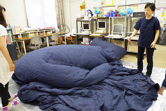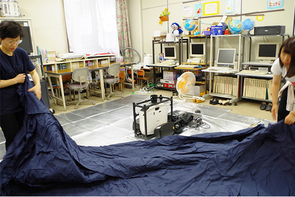 6月5日、山梨県中央市にある山梨大学付属病院の院内学級でプラネタリウムの設置が始まった。高橋さんとボランティアの大学生二人でシートをひき、投影用機材とパソコンをつないだら、エアドームの布を広げて扇風機で風を送る。ドームがみるみる膨らんで直径4m、高さ2.5mのプラネタリウムができあがると、興味津々で見ていたあゆちゃんが「やったー」と声をあげる。あゆちゃんは去年のプラネタリウムの時は体調が悪く、参加できなかった。だから今日が楽しみで一番乗りでやってきた。同病院には血液疾患や心臓・腎臓など様々な病気で入院している子供たちがいて、入院が半年を超える子供が三分の一を占めるそうだ。病院は生活の場でもある。なかなか遊びに行くことができない子供たちにとって今日は特別な、待ちに待った日なのだ。