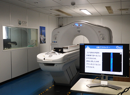 「ちきゅう」がすごいのは、チャンピオンデータだけではない。船に最先端の「研究室」を持っている事だ。驚いたのは医療用X線CTスキャナーを備えていること。海底から掘り出されたコアを1.5mの長さに切り、まずCTスキャンにかける。0.6mm間隔で画像を撮ることで、外からはわからない内部の様子や研究対象となる重要箇所を把握する。