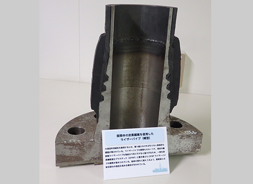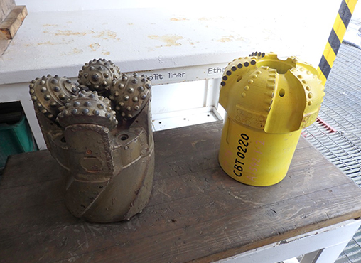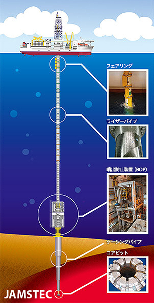 マントルを掘削するにはまず、海底4000m~5000mまでライザー掘削という方式で堀り進み、その後海底下約7000m以上掘る必要があるという。ライザー掘削とは泥水を送り込みながら掘る方式(石油掘削で用いられる方法)で、泥水の比重を利用して深くまで掘ることができる。この方式を科学掘削に用いているのは「ちきゅう」だけだが、現在のライザー掘削は3000mを超えたあたりが限界。さらに深く掘るには現在の鉄でなく新素材のCFRPを用いる必要があり、実験を始めたところだ。その他、大深度掘削用パイプの開発、長寿命掘削ピット(先端の掘る部分)など技術的課題は山積している。地球深部探査センター許正憲技術部長は「全部の技術をそろえてから掘るのでは時間がかかるので、まずパイロットホールの掘削に着手し、事前調査を行うとともに実現可能な掘削計画を作りたい」と説明する。