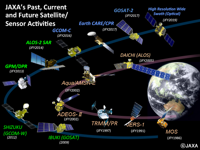 2015年11月2日に東京で行われた「地球観測衛星データ利用シンポジウム2015年」(JAXA主催)の発表によると、気象衛星ひまわり初号機(1977年7月)以来、約20機近くの地球観測衛星を打ち上げている。最初の約半分は「正確に測れるか」という技術実証だったが、後半10年では成果が出てきている。これからより精度をあげていくそう。