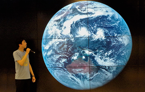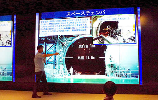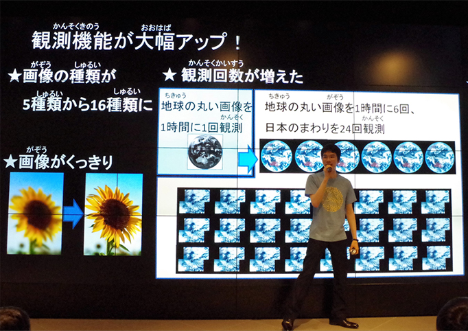 続いて、ひまわり8号を製作した三菱電機・磯部昌徳さんから衛星づくりの舞台裏についてのお話。地上と異なり、空気がない真空で、日向と日陰の温度差が激しく、放射線が飛び交う厳しい宇宙環境で、決して壊れない人工衛星をどう作るのか。衛星は宇宙で故障しても修理に行けない。天気予報は地上の人たちの生活に直結するため、失敗は許されない。たくさんの試験をすべて100点満点でクリアしてきた例が紹介された。「ひまわり8号を作るのに大変だったのは?」という子供たちの質問に対して磯部さんは「とても精度の高いカメラを載せているため、少しの振動でも手ぶれのような状態になってしまう。カメラをきちんと地球に向けてできるだけ動かないように設計するのが大変だった」と回答。観測機が高性能になればなるほど、安定して動かす衛星本体の開発も苦労の連続なのだ。