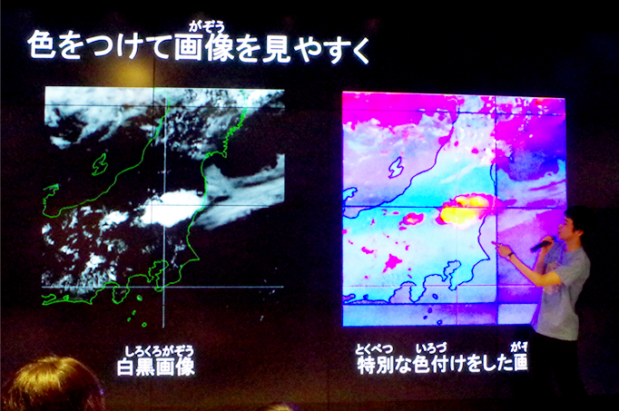 イベント後に藤森さんに「ひまわり8号」になって天気予報の伝え方が変わったかを聞いた。「テレビでは24時間の雲の流れを動画で見せることが多いが、動きがなめらかになって、解説がしやすくなりました。また日本付近で急に発達する積乱雲やゲリラ豪雨の実況監視が従来と全然違います。今まではレーダーを見て実況監視をしていました。今はレーダーと合わせてひまわり8号の画像を見て、『ここにこの雲があるからゲリラ豪雨が起こったんですね』とか『ここで積乱雲が発生しているから、これから大雨が降るかもしれません』と伝えられます。」