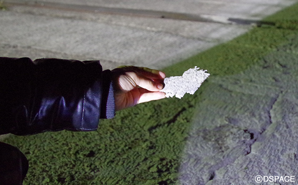 しかし打ち上げ数時間後に発射台の下まで見せてくれるとは太っ腹だ。峯杉賢治・内之浦宇宙空間観測所長自ら案内してくださり、どんな初歩的な質問にもわかりやすく答えてくださる。「発射台の下はもっと真っ黒焦げかと思ってました」という(アホな)質問をしたところ、「焦げるのは炭素が含まれている場合だけです」との答え。なるほど、沿道に使われている耐火セメントには炭素が含まれていないわけだ。だが数千度もの噴煙が通り抜けた筋状の模様が刻まれ、はがれた破片が散らばり、噴射のすさまじさを物語っていた。