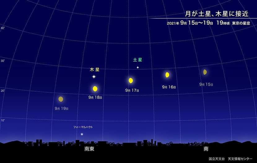 2021年9月、ぜひ月を眺めてほしいと思う絶好のチャンスが2回ある。まずは9月16日から18日にかけて。月と木星・土星のランデブーが見られる。今も日没後の南東の空に木星と土星が明るく輝いていて目を引きますよね。その惑星たちの近くを、上弦を過ぎ、徐々に満ちていく月が日ごとに東へと位置を変えていく。夜のお散歩の楽しみが増えるはず。