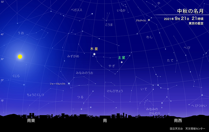 そして、満月となる21日。この日は「中秋の名月」でもある。「中秋の名月」とは、旧暦(太陰太陽暦)の8月15日の夜に見える月のこと。明治5年まで使われていた旧暦は、月の満ち欠けをもとに日付が決められていた。新月が1日で(ほぼ)満月が15日。7~9月が秋とされていて、ちょうど真ん中にあたる8月15日を「中秋の名月」としたのだ。ただ、現在使われている暦(太陽の動きをもとに作られている)では「中秋の名月」は必ず満月になるとは限らない。月の公転軌道は楕円形で、新月から満月までにかかる日数が13.9日から15.6日と大きく変化することなどがその理由だ(詳しくは欄外の国立天文台のウェブサイトを参照)。「中秋の名月」がちょうど満月になるのは2013年以来、8年ぶりのこと。