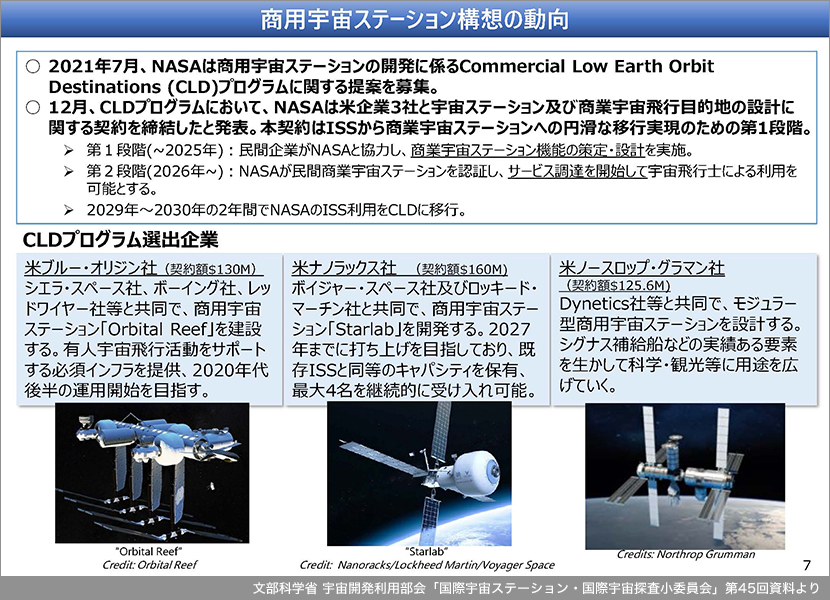 確かに最近、有人宇宙開発の話題が相次ぐ。2021年、宇宙旅行が一気に花開き、28人の民間人が宇宙を旅した。2021年12月、NASAは商業宇宙ステーションに関して3社の企業と契約を結んだと発表。ブルーオリジン社、ナノラックス社、ノースロップ・グラマン社はそれぞれ100億円以上の契約を得て、商業宇宙ステーションの設計を2025年までに実施する。2020年代後半にはNASAがサービス調達を開始、宇宙飛行士による利用を可能に。2030年までにNASAは地球低軌道の活動をISSから商業ステーションに移行していこうと計画している(Commercial Low Earth Orbit Destinations(CLD))。日本企業の中にはこれら米国の商業宇宙ステーションとタッグを組み、宇宙ビジネスに乗り出そうという動きもある。2030年代の地球低軌道活動の主役はこれら商業宇宙ステーション(と中国の宇宙ステーション)になるかもしれない。