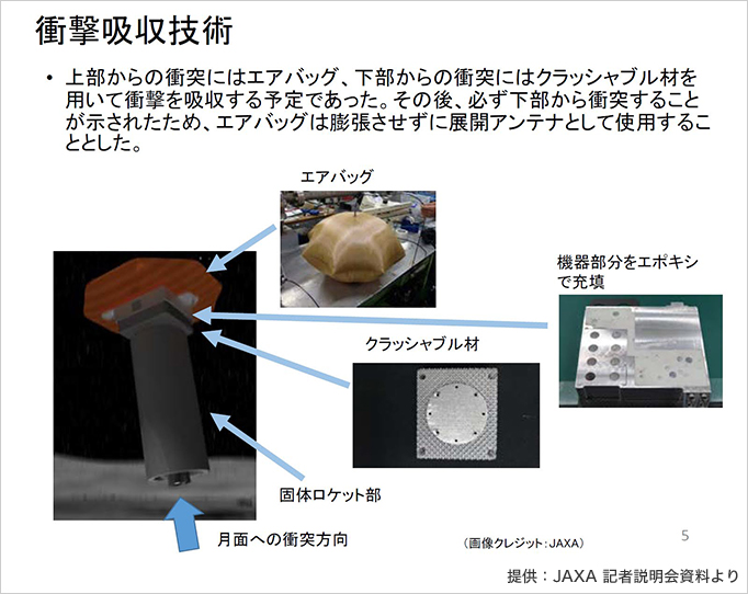 6年前の取材時は、衝撃吸収には主にエアバッグを用いる予定だった。その後の検討で、着陸時は必ず固体ロケット部から月面に衝突することが決められたため、エアバッグは膨張させずアンテナとして使用。衝撃吸収には、主としてアルミでできたクラッシャブル材を使用することにした。さらに機器部分はエポキシ樹脂を充填し、がちがちに固めることに。それでも衝突時には8000~1万Gもの重力加速度を受けるという。
