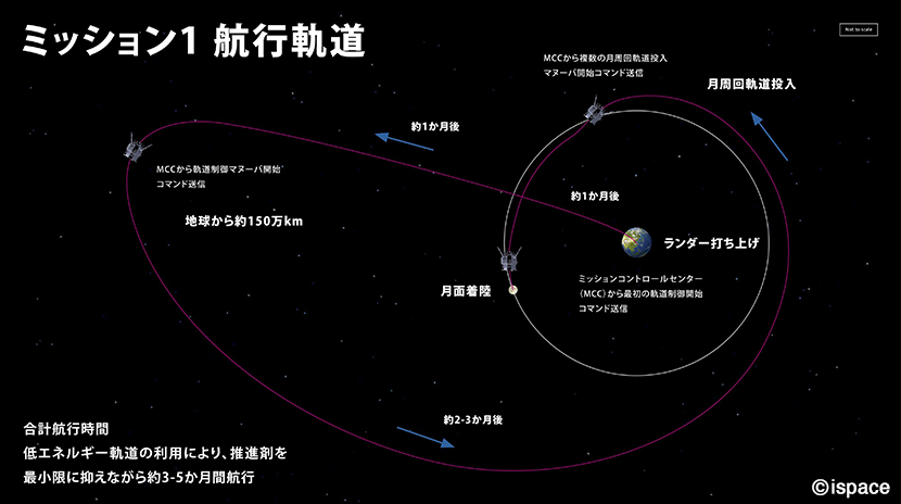 具体的に、今回のミッション1でランダー(月着陸機)は下記の図のような軌道を飛ぶ。打ち上げ約50分後にランダーはロケットから分離される予定。その後、月を超え地球から約150万km彼方まで到達、月重力圏に戻ってきた後に月の周回軌道に投入、月に着陸する。