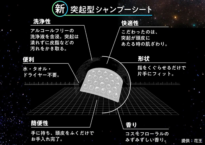 「シート型の商品はこれまでも(花王で)出しています。体の中で一番皮脂が出るところは頭皮です。本当は頭皮を洗いたいのに、頭には10万本の毛が生えている。その髪の毛が邪魔で、普通のシートでこすろうと思っても根元に届かないんです。そこで突起が大事だとなったわけです」