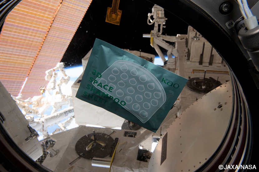 例えば、若田さんが宇宙到着後間もない頃に使った3D Space Shampoo Sheet(3Dシャンプーシート)。「凹凸の形状でマッサージしながら頭を洗えるので、お風呂やシャワーのない国際宇宙ステーション(ISS)でも、水を使う必要なく根元からすっきり洗える。香りも爽快です」と若田さんはコメントしている。