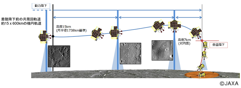 まずは、どうやって月にピンポイント着陸をするのか見ていこう。2023年1月時点の計画によると、SLIMは打ち上げから3~4か月後に月周回軌道に到着、約1ヶ月間月を周回した後に、いよいよ着陸を目指す。高度約15kmから秒速約1700m(旅客機の約7倍のスピード)で降下スタート。着陸までの時間は約20~30分。