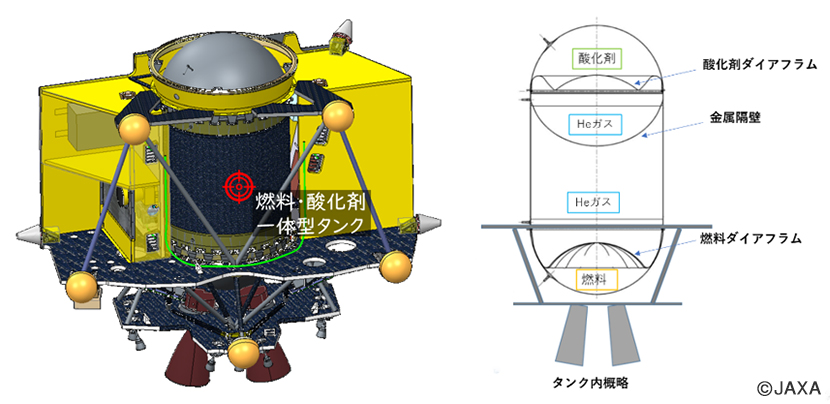 小倉プロマネがチャレンジングな設計として例にあげたのは2点。1つは推進剤を入れるタンク。推進剤は燃料と酸化剤からなり、ロケットなどの宇宙機では宇宙機のBODY(構造体)の中に、燃料と酸化剤それぞれのタンクを入れることが多い。ところがSLIMでは、JAXAが新しく開発したタンクを採用し、燃料と酸化剤を一つのタンクに入れた上で、タンクが探査機のBODYを兼ねる。つまり推進剤タンクがむき出し!ざっくり言えばタンクの外側に様々な機器をとりつけている。