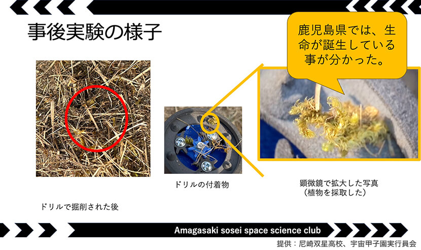回収した缶サットは電源が入ったため、生徒たちは打ち上げ実験を行ったグラウンドに再び戻り、事後実験を実施。缶サットは問題なく自立し、ドリルで掘削を行った。プレゼンで生徒は「想像してください。探査衛星が適切な姿勢で着陸している達成感」と呼びかけ、逆立ちしてしまった月着陸機SLIMの画像を投影。「尼崎双星高校の自立展開機構で体制を戻せます」。そして会場で、横になった状態の缶サットが立ち上がるところを実演すると会場からどよめきが。今後は電源スイッチに改良を加えるそう。