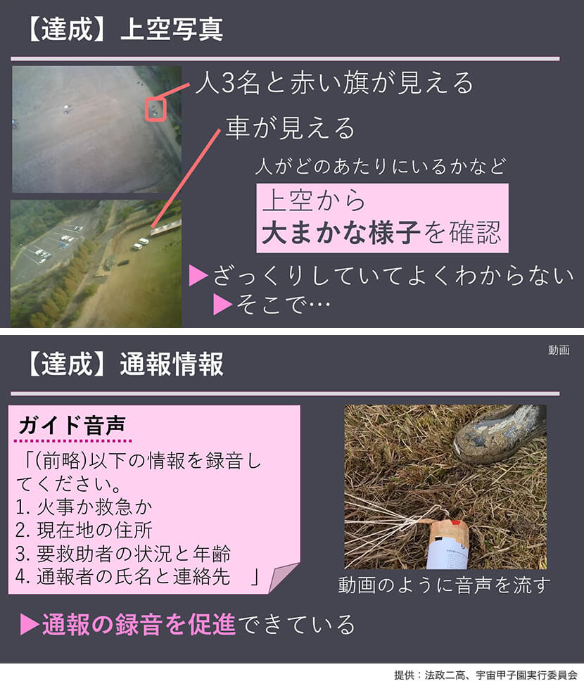 そこで上空と地上で写真を撮影。ユニークなのが「通報情報」だ。要救助者に状況や住所などを缶サットに録音してもらう。録音データを含め缶サットが得た気温や湿度・GPS情報などを専用ウェブサイトに掲載。日本地図上に観測した場所を表示し、クリックすると要救助者の状況や周辺の画像などの情報が、簡単に得られるように整備した。