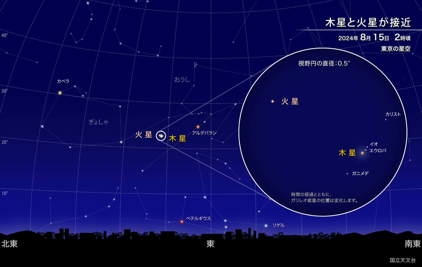 ペルセウス座流星群のピークが過ぎた8月半ばには火星と木星が、20日から21日にかけて月が土星と接近する様子が見られる。また8月27~29日には月が木星、火星に接近し、3つの天体が寄り添うように輝くさまが夜空を彩るという。