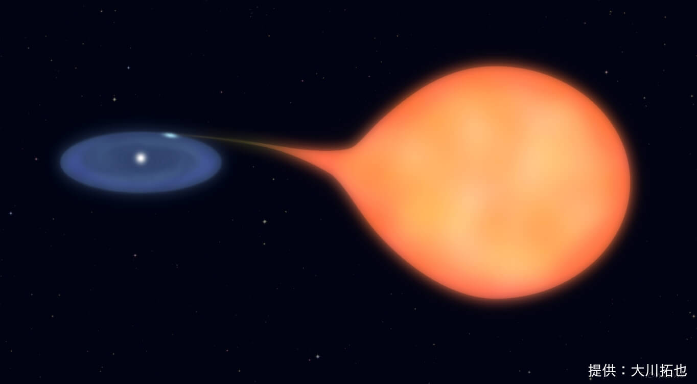 約80年ぶりに星が明るくなるってどういうことだろう。大川さんによると、見慣れない星が、夜空に突然輝くように見える「新星爆発」と呼ばれる現象があるそうだ。しかし、新星といっても新しい星が生まれるわけではないし、星の最後の大爆発、超新星とも異なる。その正体は、かなり接近した二つの星からなる連星系だ。白色わい星という小さく暗い星に、隣の星からガスがどんどん流れ込み、やがて核融合反応を起こして爆発的に明るくなるという現象だ。明るさは一時的に1万から10万倍にもなると言われる。