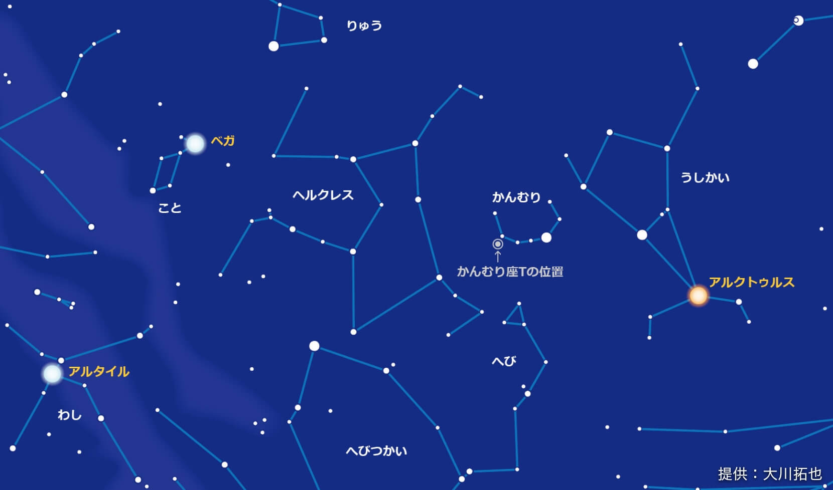 かんむり座は、2~4等の星からなる小さな星座でなかなか見つけにくいかもしれない。上の図を参考にうしかい座のアルクトゥルス(0等)を目印に、星座アプリなどで探してみよう。かんむり座Tは、かんむり座の半円形の星の並びのすぐわきに位置する。80年もの長い眠りから覚め、この夏に爆発が起こるかどうかは、誰にもわからない。だが今年中には起こるかもしれないと注目されているそうだ。