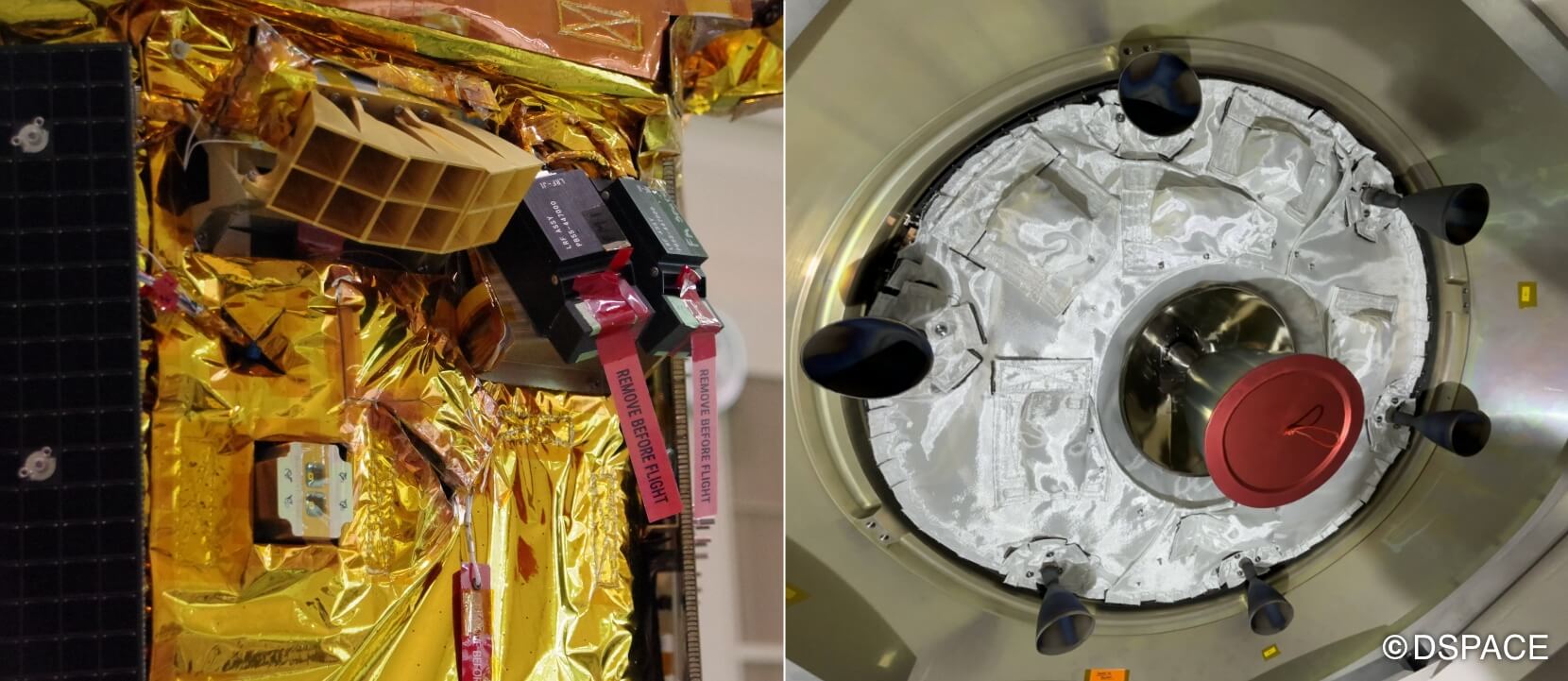 さて、いよいよ月着陸機「レジリエンス」との対面だ。2023年からJAXA筑波宇宙センターで試験を開始、今年5月からはフライトモデルの振動試験や熱真空試験などを行ってきた。ispaceは、世界中から優れた技術を集めインテグレートするのも特徴の一つ。スラスタ(エンジン)はドイツ・アリアングループから購入しており、ミッション1では組み立てや試験をドイツで実施、発射場のあるアメリカ・フロリダ州に輸送した。ミッション2では、アリアングループのスラスタを採用することは変わりないが、スラスタの主要部や配管以外の組み立てや試験は、JAXAの施設を借りて行っている。