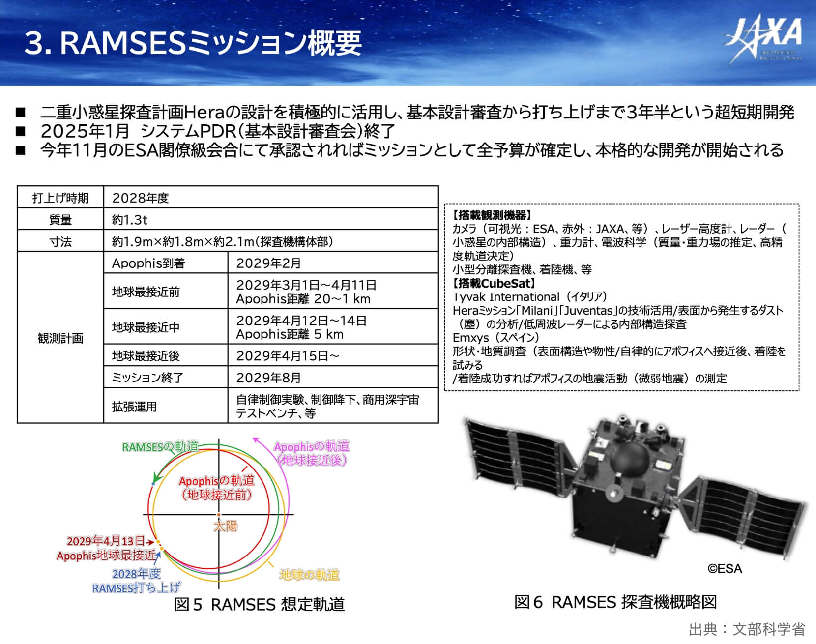 現時点の計画ではRAMSESの打ち上げは2028年度。アポフィスに到着するのは2029年2月。アポフィスが地球に最接近する前の3月1日~4月11日は20~1kmの距離に、4月12日~14日の最接近時は5kmの距離までアポフィスに接近し観測する。最接近時にはアポフィスの形状や表面の変化を、分解能10センチメートルの高解像度観測を実施する予定だ。地球重力の影響で、アポフィスの公転軌道、自転軸や速度が変化する可能性がある。さらにアポフィスで地滑りや地震、変形が起きるかもしれない。こうした小惑星の変化を把握することで、今後、小惑星が地球に接近した時に、どう対処したらいいかという対策に役立てる。