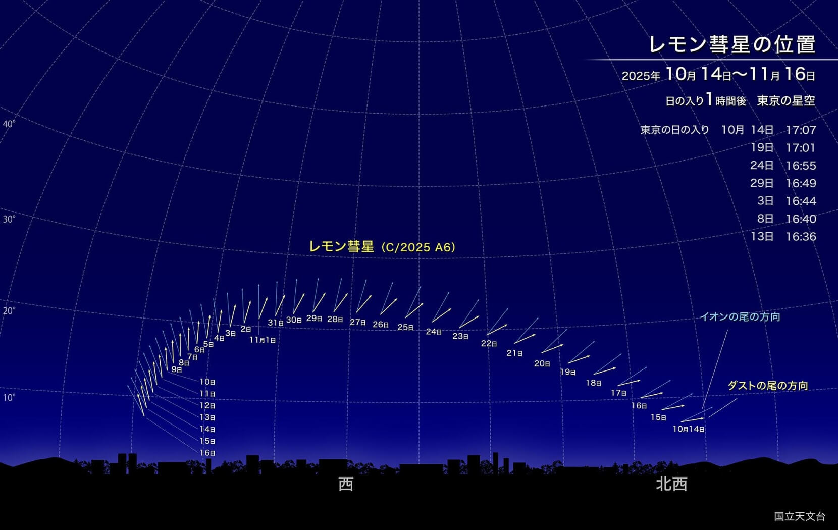 地球に最接近したのは10月21日、そして太陽にもっとも接近するのが11月8日(日本時間)。国立天文台によると10月下旬から11月上旬がもっともレモン彗星が見やすい時期になるそうだ。夕方の西の空低くで観察できる可能性がある。