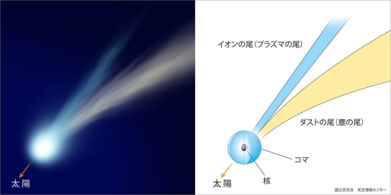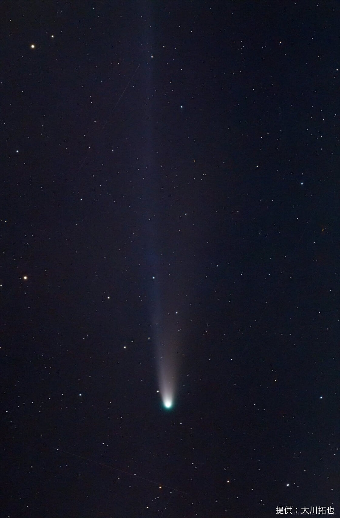彗星には一つ一つ個性があります。レモン彗星は太陽に近づくにつれて2種類の尾が日々変化してます。イオンの尾とダスト(塵)の尾があって、太陽に近づくにつれて尾が長く伸びたり、イオンの尾が形を変えたり、ダストがたくさん放出されたりして尾のすがたが変化しています。宇宙飛行士の油井亀美也さんがISS(国際宇宙ステーション)から撮影したレモン彗星は大気の影響もほぼ受けないので、尾がうしかい座の頭のほうまで長くきれいに写っていますよね。