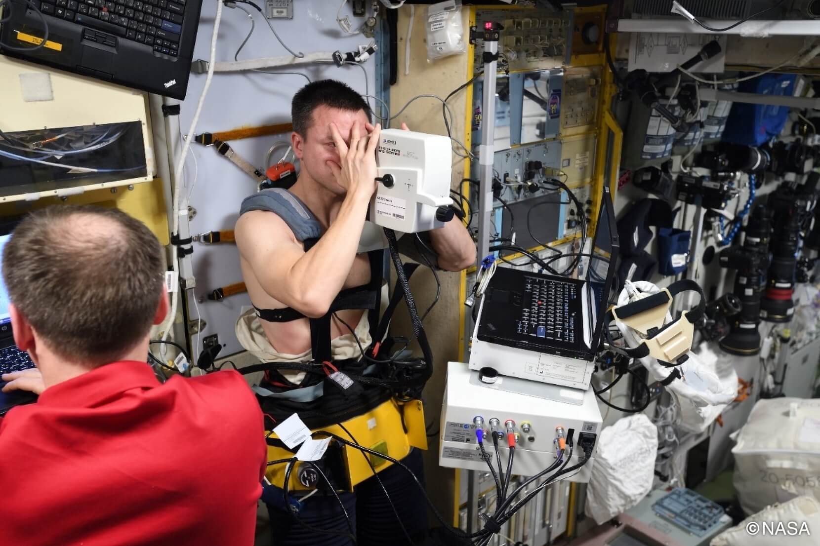 その一つが、「眼の変化」。2016年にDSPACEでこの話題を紹介した際は、宇宙飛行士の約半数に視力の変化があると書いたが、その後の状況について改めて日本大学の岩崎賢一教授に取材したところ、「長期宇宙滞在している宇宙飛行士はほぼ全員に何かしら眼の変化があってもおかしくない」とのこと。ただし、眼に変化があっても、本人に自覚症状がない場合がほとんどだという。その原因は詳しくわかっておらず、さまざまな実験が進行中だ。
