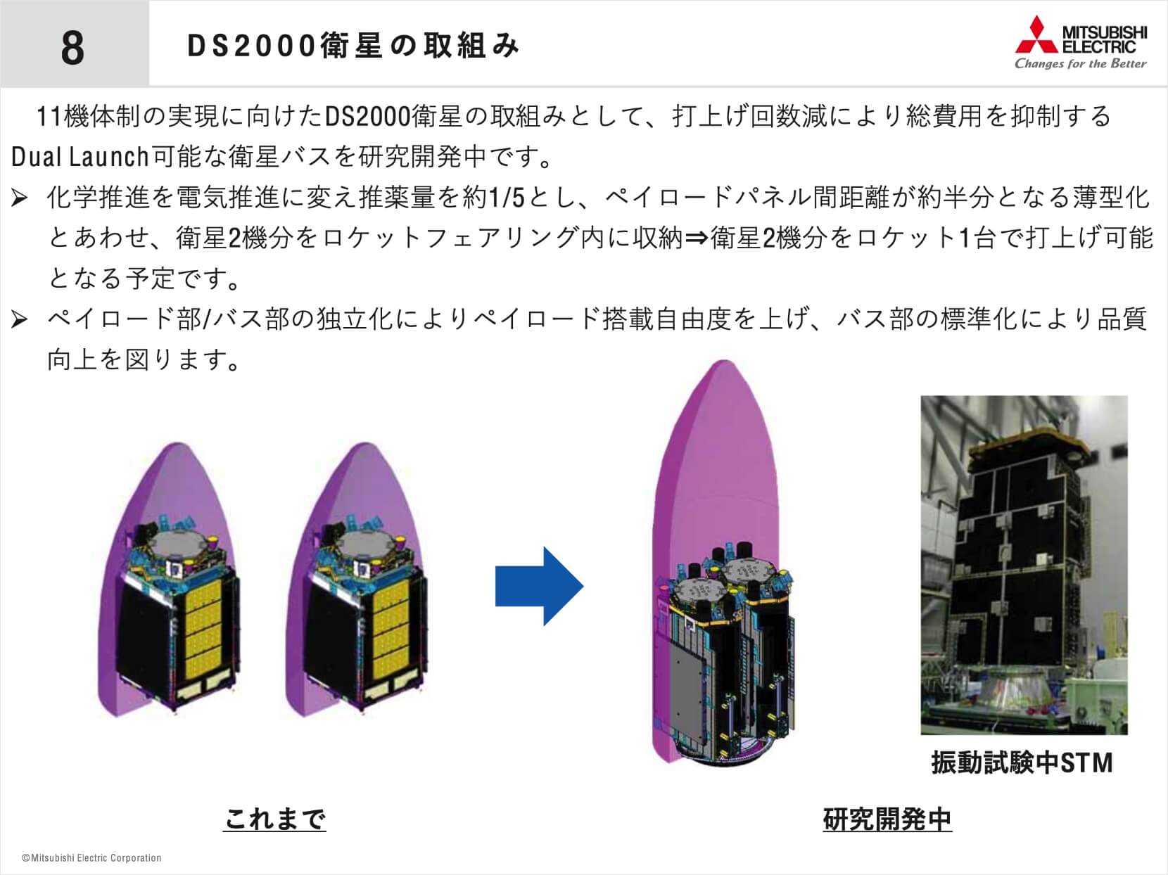 みちびき11機体制への取り組みとして、DS2000に革新的なチャレンジが進行中だ。具体的にはみちびき衛星2機をロケット1機に搭載して打ち上げ回数を減らし、総費用を削減する。スリム化の肝になるのは、上の図の衛星解剖図で中心にある推進モジュール。円筒形のシリンダーに燃料が入っている。現在は化学燃料を使っているが、これを電気推進に変えることで推進薬の量を約5分の1に圧縮できる。すると推進モジュールを取り囲むペイロードパネル間の距離を約半分に薄くすることができるという。