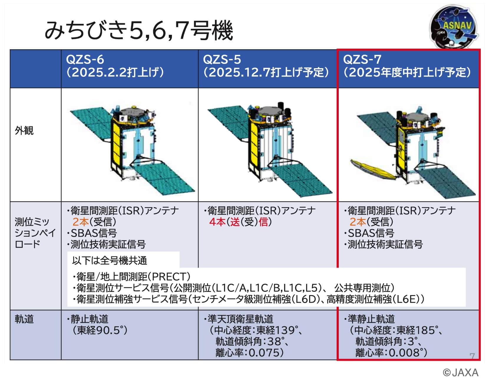 ところで5号機、6号機と比べると7号機には大きな違いがある。上の図を見てもらうと、大きなアンテナがついている。直径3mのアンテナでメッセージサービスを行うためのものだ。2017年に打ち上げられたみちびき3号機にもメッセージサービス用のアンテナが搭載されているが設計寿命は約15年間。3号機アンテナにトラブルがあった際などに7号機のアンテナを使うことになる(3号機のアンテナは海外製だったが、7号機のアンテナは三菱電機製とのこと)。