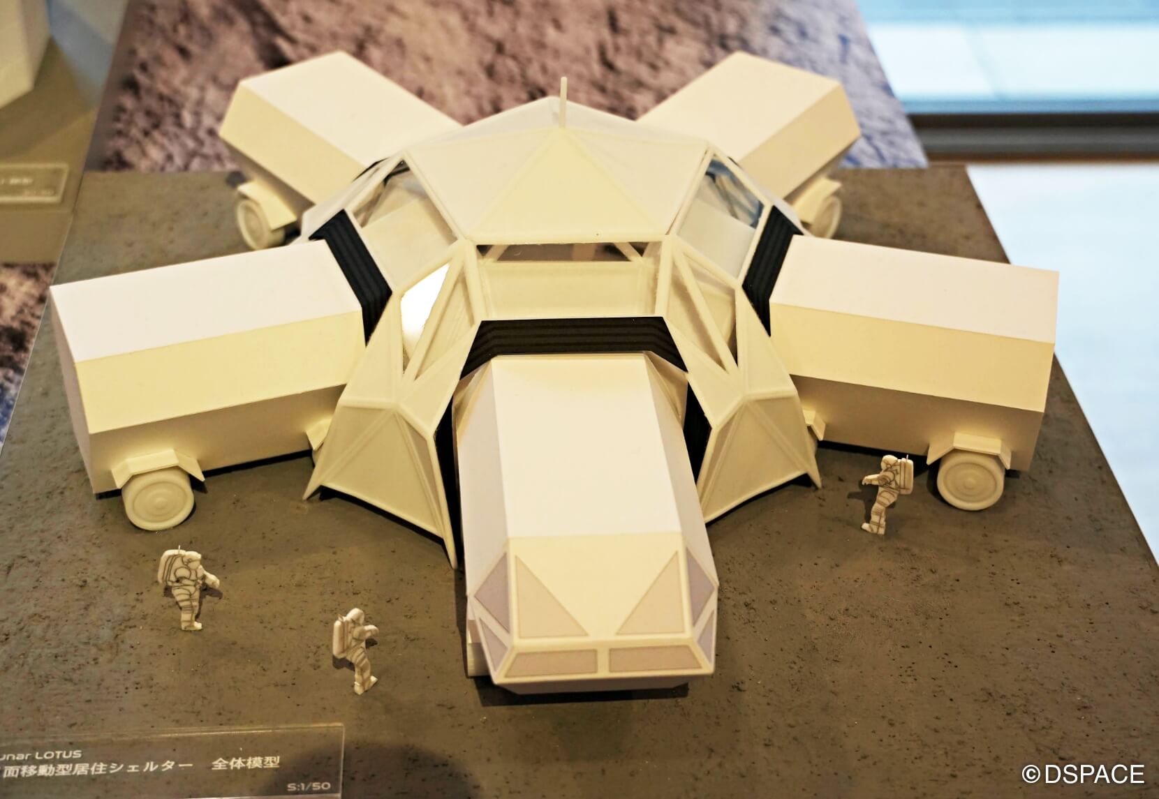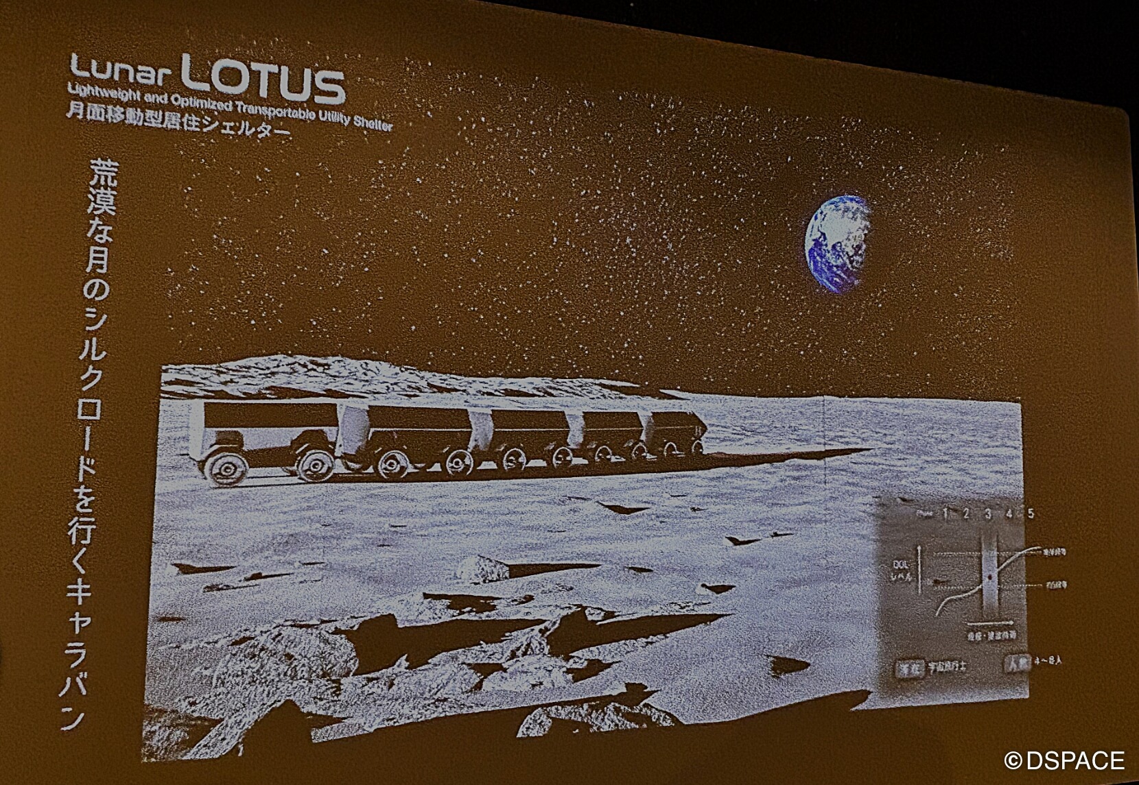 ユニークなのがフェーズ3のLunar LOTUS。現在、日本は国際探査計画アルテミスの元、月面を移動しつつ探査する2人乗りの有人与圧ローバーの開発を進めている。だが長距離の移動時、4畳半(実質、宇宙飛行士が使えるのは約3畳)の空間でずっと2人で顔を突き合わせているのは厳しいかもしれない。また何らかのアクシデントが発生する可能性もある。そんな時の可搬型多機能シェルターがLunar LOTUSだ。有人与圧ローバーが複数のキャビンを引っ張り移動する。キャビンにはシェルターのフレームやパネルを積んでいて、簡単に組み立てることができる。その後はローバーが長距離移動する場合の中間拠点(月の道の駅)として使える可能性もある。「これ、実際にあるといいですよね」と展覧会に来ていたJAXA関係者にも高評価だった。